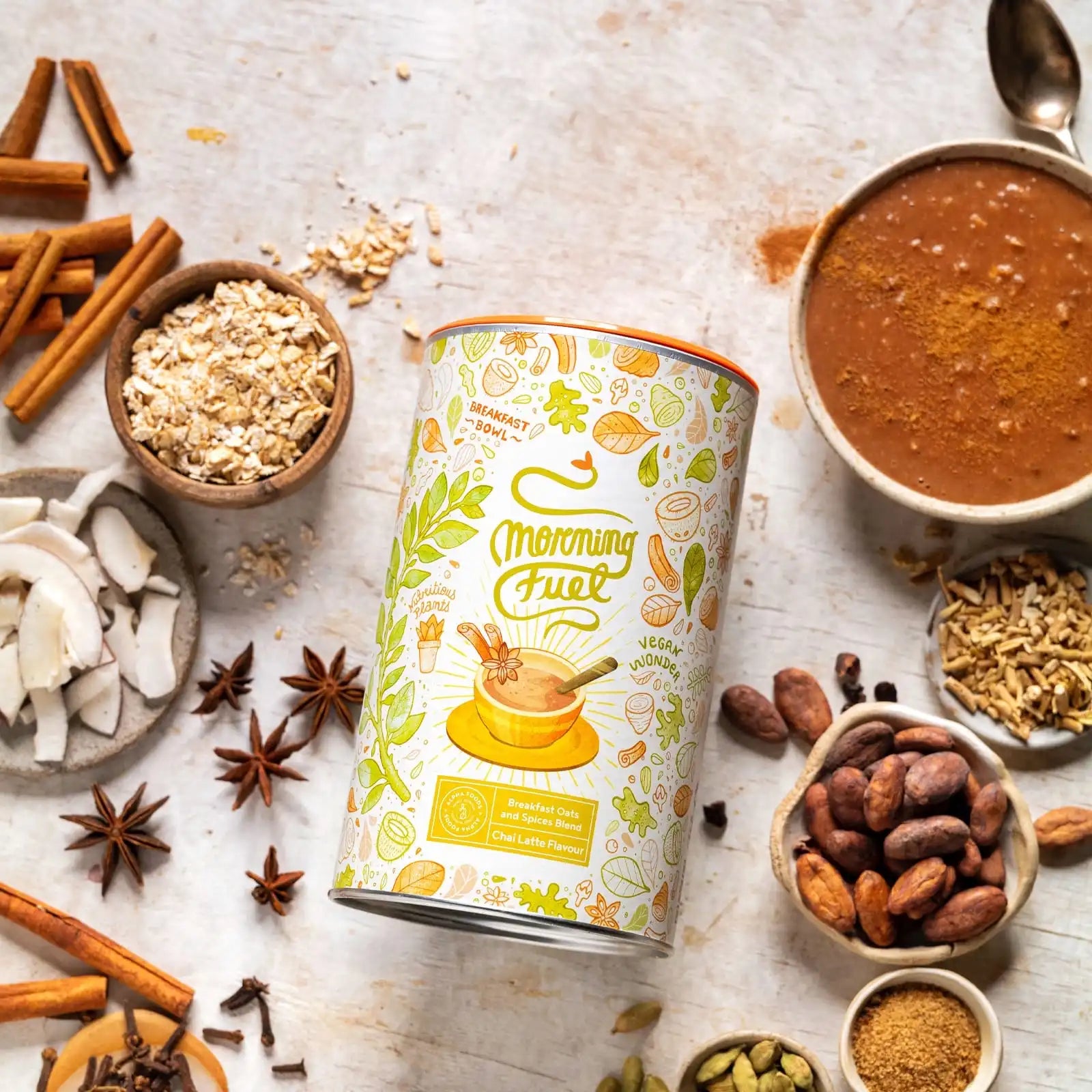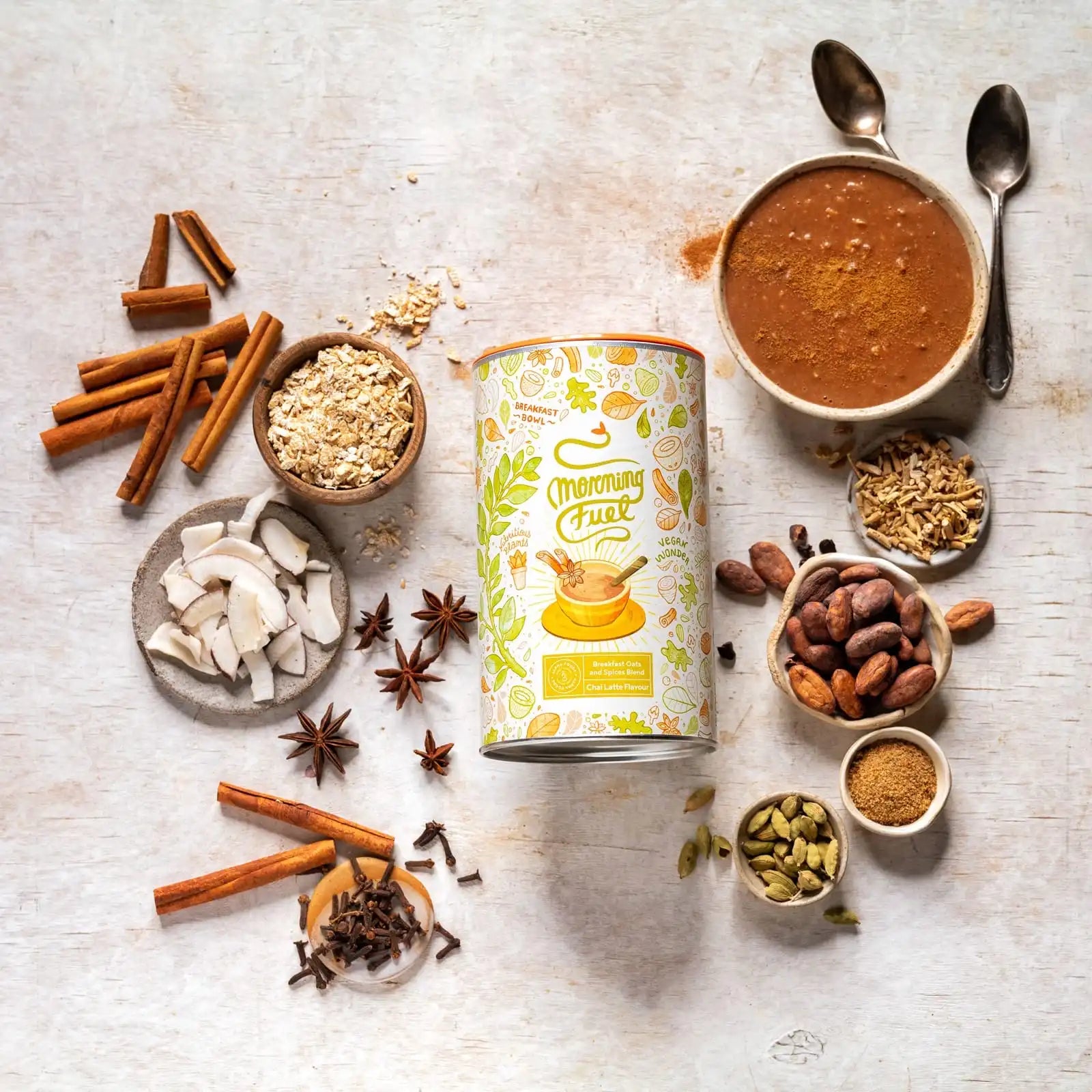 Miscela per colazione vegana al gusto chai latte. Con proteine, carboidrati complessi e maca. (Dimensioni: 500 g)